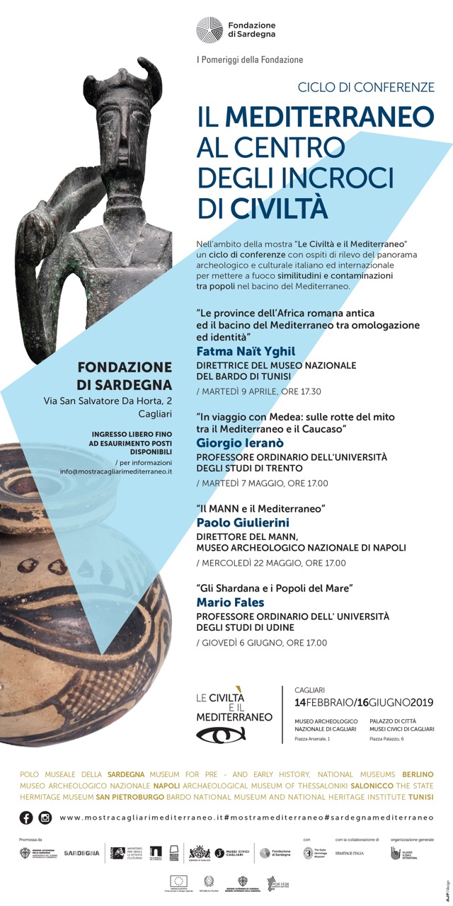 Nell'ambito della mostra "Le Civiltà e il Mediterraneo”, promossa da Regione Sardegna, Fondazione di Sardegna, Polo Museale della Sardegna e Musei Civici di Cagliari, si terrà, nella sede di Fondazione di Sardegna, un ciclo di conferenze con ospiti di rilevo del panorama archeologico e culturale italiano ed internazionale per mettere a fuoco similitudini e contaminazioni tra popoli nel bacino del Mediterraneo.