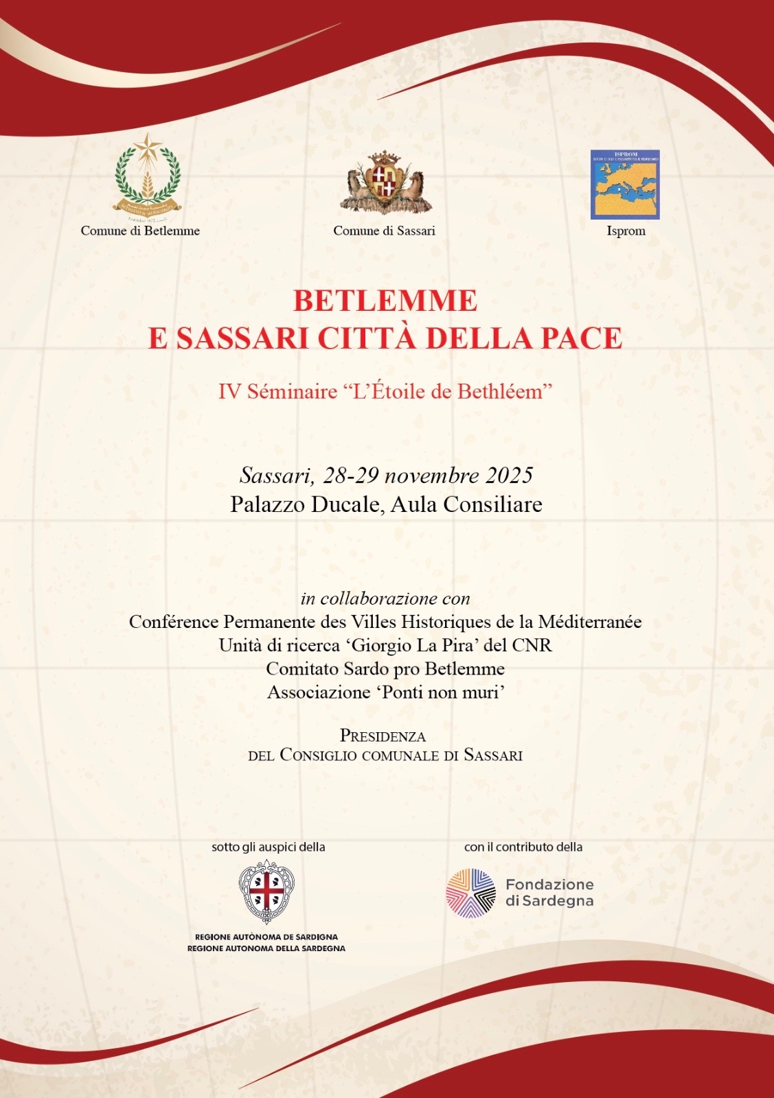 Si svolge il 28 e 29 novembre a Sassari, nell’Aula Consiliare di Palazzo Ducale, il IV Seminario L’Étoile de Bethléem (La stella di Betlemme). L’iniziativa, dedicata al tema Betlemme e Sassari città della pace, è promossa dall’ISPROM – Istituto di Studi e Programmi per il Mediterraneo, organizzata con il Comune di Betlemme e il Comune di Sassari.